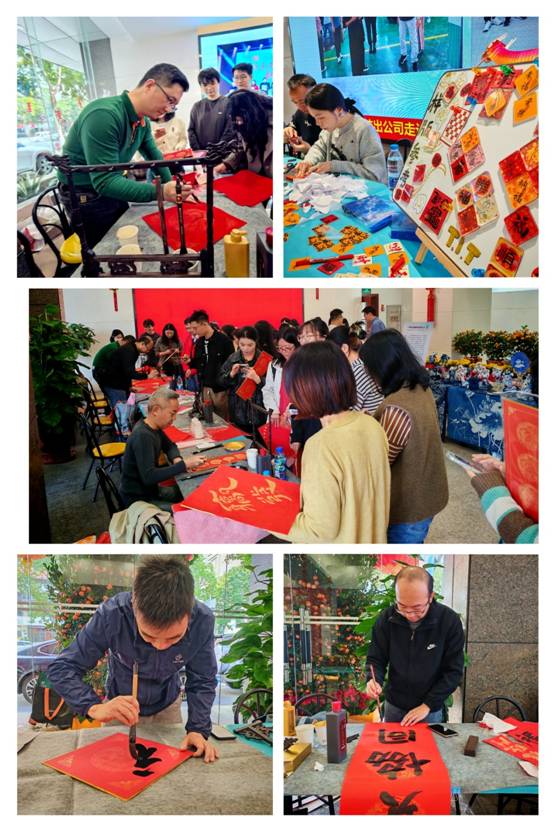 吉祥福手送祝福。在廣德一樓大堂,公司4位書法愛好者張漢彬、李運峰、吳宏景、禤俊峰應邀揮墨送福;設計師黃雨桐巧妙手工制作福字冰箱貼,大堂喜氣洋洋,年味十足,上百名員工參加現(xiàn)場接?;顒?。福手們凝神靜氣,手腕妙轉,在一張張紅紙上揮灑自如地書寫“?!弊趾透魇郊榇郝?lián),一個個蒼勁有力或流暢飄逸或趣味可愛的“?!眰鬟f到接福的同事們手上,大家眉開眼笑,幸福綻放。這一傳統(tǒng)習俗承載公司對廣大員工的新年美好祈愿與祝福,場景溫馨而充滿喜悅?;顒蝇F(xiàn)場共送出500多份福字作品。