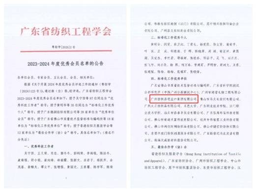 廣州紡織品進出口集團有限公司(以下簡稱“紡出公司”)在2024年廣東省紡織工程學(xué)會開展的2023-2024年度優(yōu)秀會員評選活動中,榮獲“標準化工作優(yōu)秀單位”稱號。關(guān)勇獲評為“標準化工作優(yōu)秀個人”,張菁、陳繼成、孫立大和高新武獲評為“優(yōu)秀科技工作者”。這一榮譽是對公司團隊專業(yè)能力和敬業(yè)精神的高度贊揚,也是激勵每一位員工繼續(xù)秉承匠心精神,不斷探索與實踐,為紡織行業(yè)的進步貢獻更多力量的巨大動力。